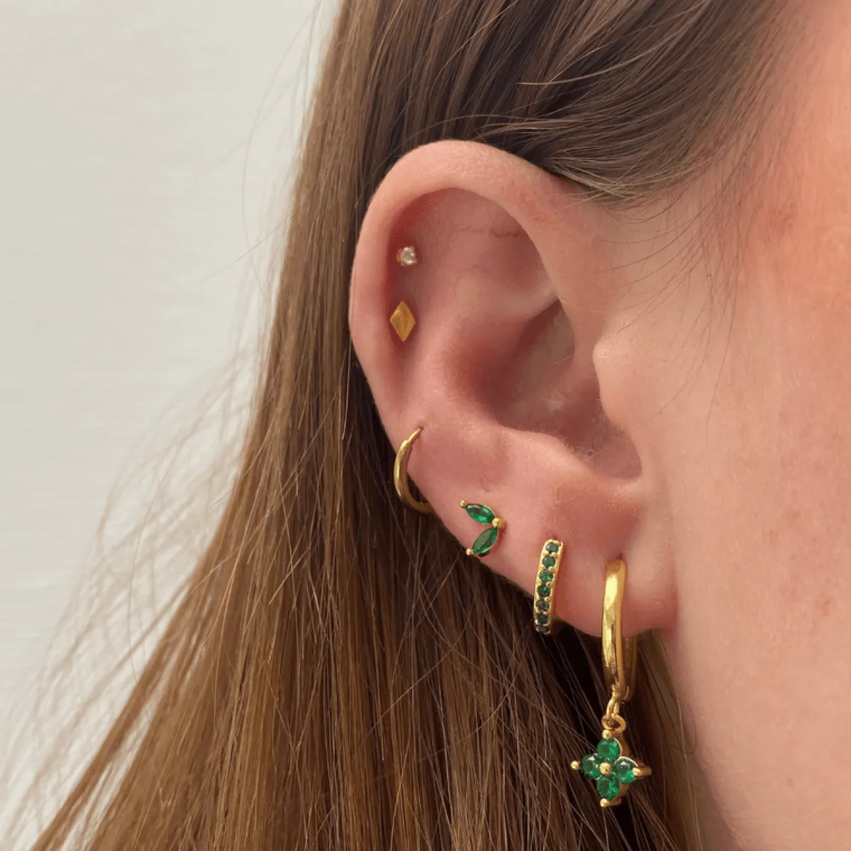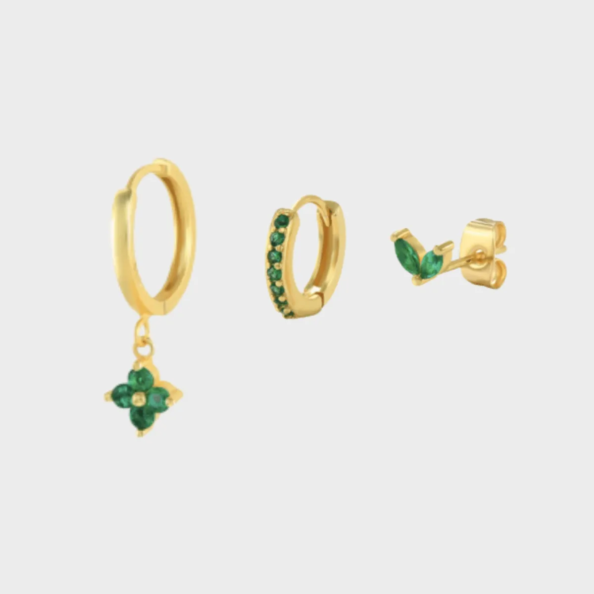 Smukt øreringesæt med grønne sten og en botanisk vibe.