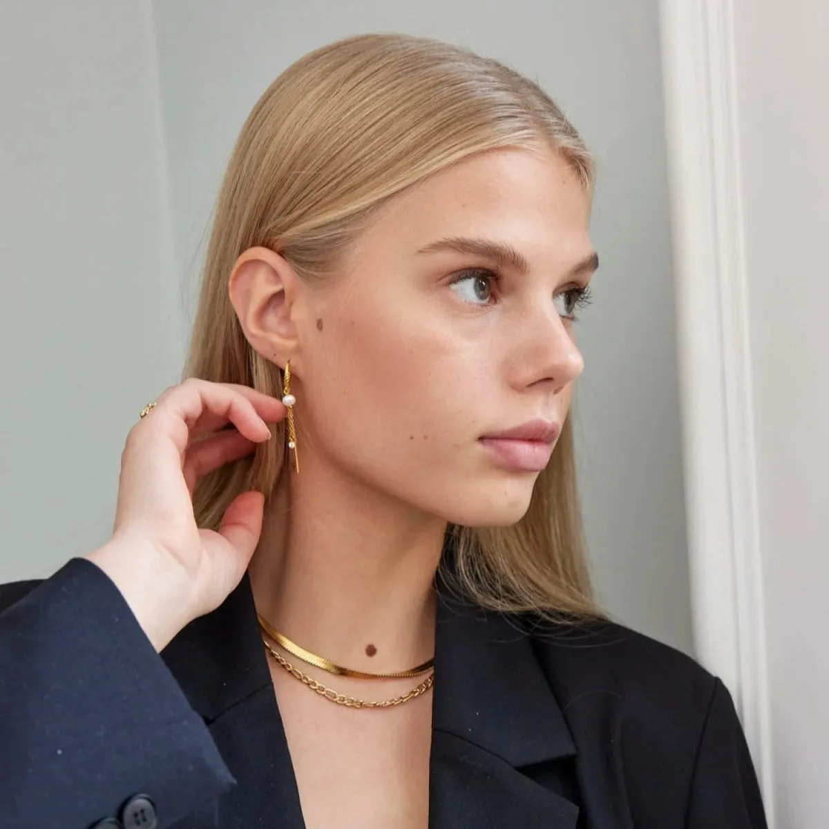 Vores Malou øreringe, er de fineste lange perleøreringe, med både en perle og kædedetaljer. Øreringene er produceret i guldbelagt sterlings sølv, som gør at du er sikret en super kvalitet, til billige penge. Udover at øreringene er udsmykket med en lille perle, så er der også en lille zirkon/diamant i en af kæderne. Øreringe er smukke alene, men kan også bare med blandt andet vores mini twisted hoops, hvis du har flere huller i ørene. De lange perleøreringe er en god gaveidé til kvinder eller piger, i alle aldre. Det kan også være et godt bud på øreringe til konfirmationskjolen!