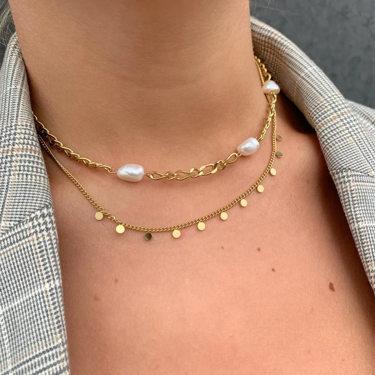 Perlehalskæde i et moderne design. En justerbar kæde med perlevedhæng. Perle halskæde med små runde perle vedhæng. Perle halskæde findes i guld – og sølv farvet. Perlehalskæder er et tidsløst og klassisk smykke som kan gå til næsten ethvert outfit. Denne perlehalskæde har fået et mere moderne udtryk med den chunky kæde. Hos Winther Studio finder du flere forskellige varianter af smukke perlehalskæde i både guld, sølv og andre materialer som rustfri stål. Se for eksempel vores smukke Luna halskæde med perler. Køb din nye perle halskæde hos os!