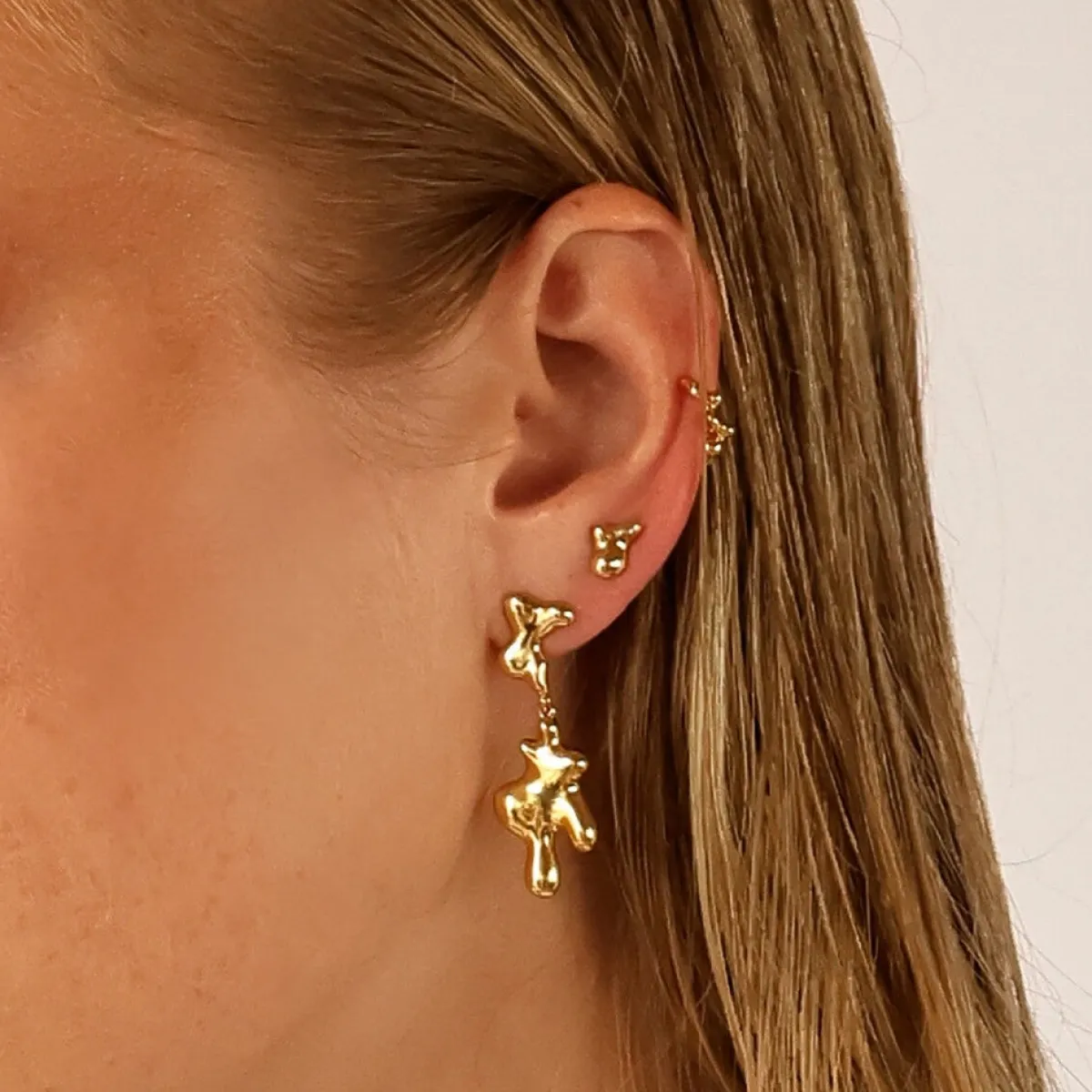 Nimbo Drop øreringene, skabt i samarbejde med Sidsel Juel, er en del af en smykkekollektion inspireret af hendes livslange fascination af himlen. Øreringene har organiske former og hænger smukt fra øret, hvilket giver en drømmende og elegant effekt.