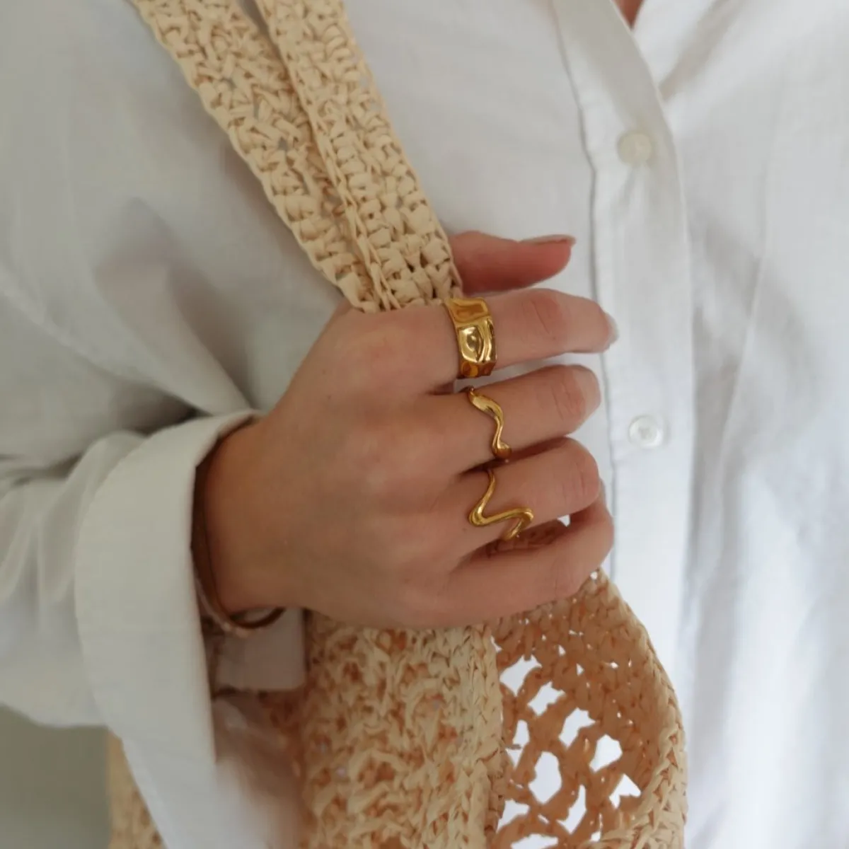 Den anden ring er vores ‘Lilia Ring’ der er en tekstur ring med en rå bølget overflade. Denne ring har et banket look og er meget moderne og trendy. En chunky ring der skaber et iøjnfaldende look og giver et råt finish til dit smykkelook.