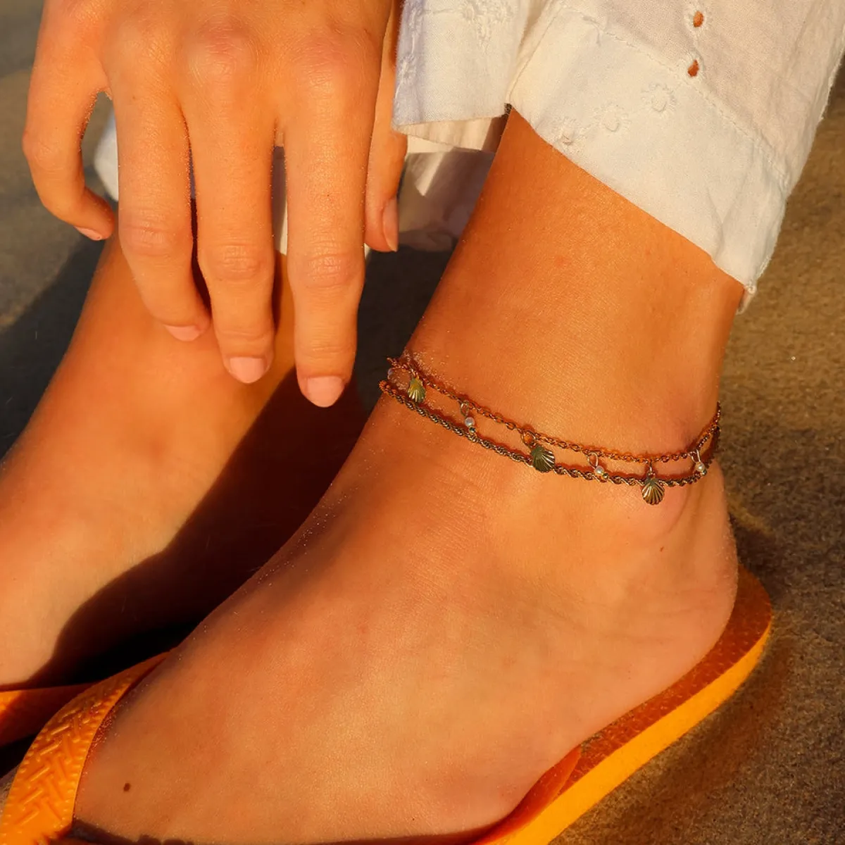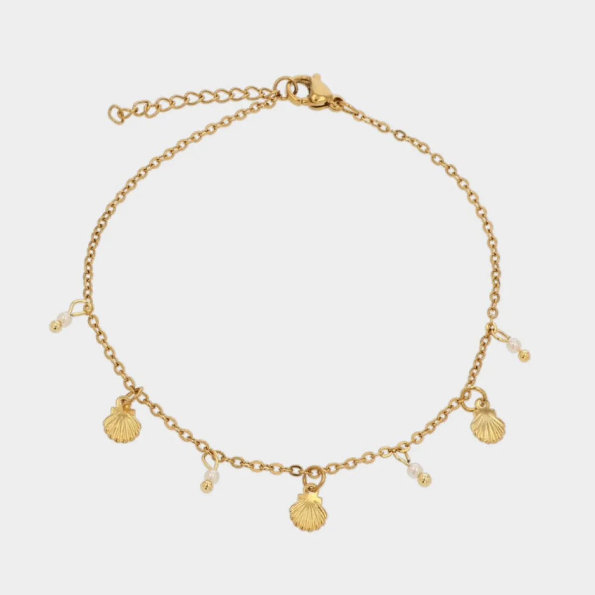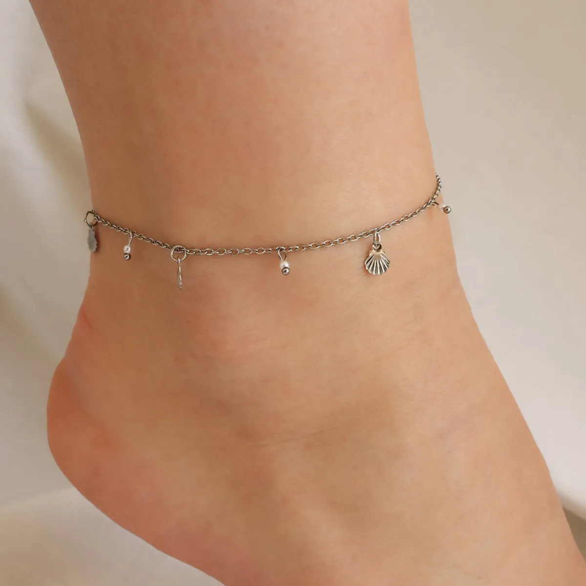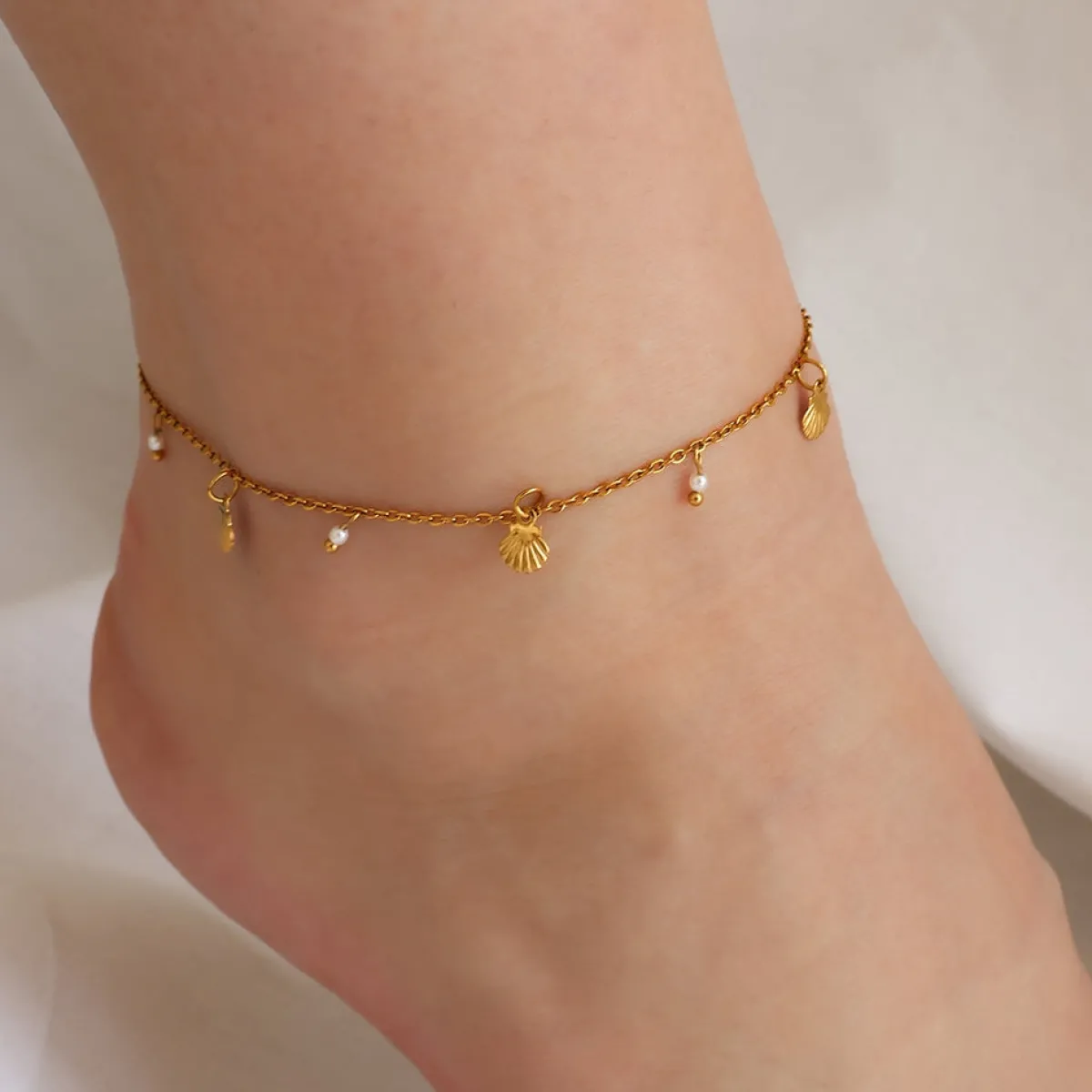 Denne smukke ankelkæde er designet med inspiration fra strandens muslinger og havets perler.