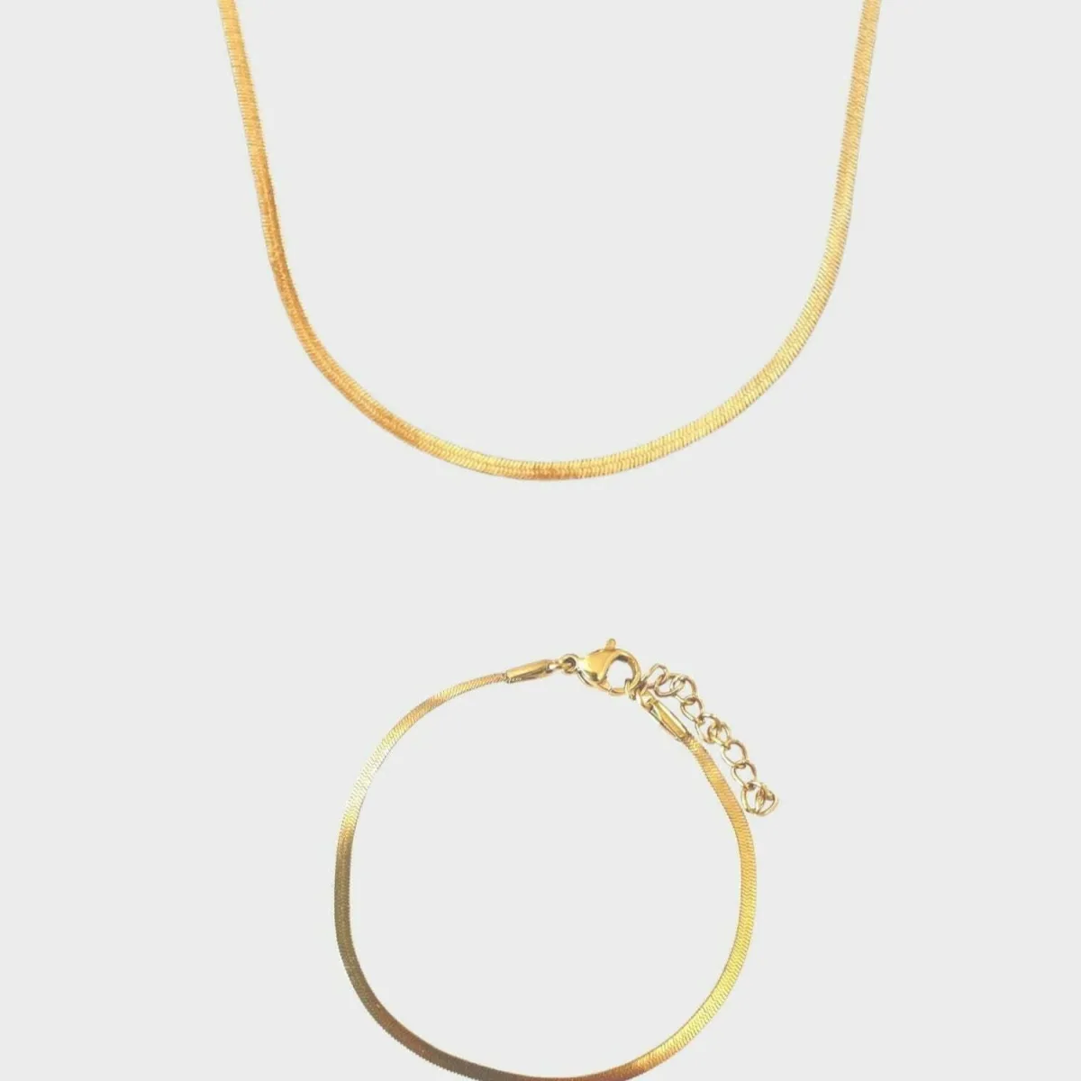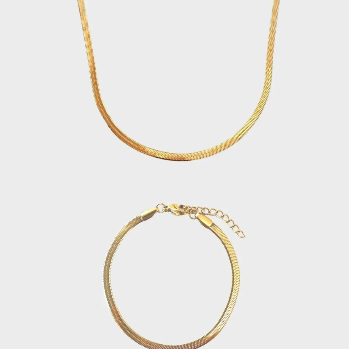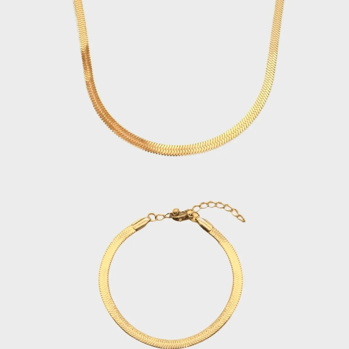 Slangekæde mix guldfarvet i vandfast materiale. Sættet består af vores Flat Snake halskæde og vores Flat snake armbånd. Dette slangekæde smykkesæt er det perfekte simple mix til din smykkesamling. Slangekæden er en tidløs kæde, der passer til det meste og er nem at style med andre smykker. Derfor er vores slangekæde smykke mix perfekt til din smykkesamling!