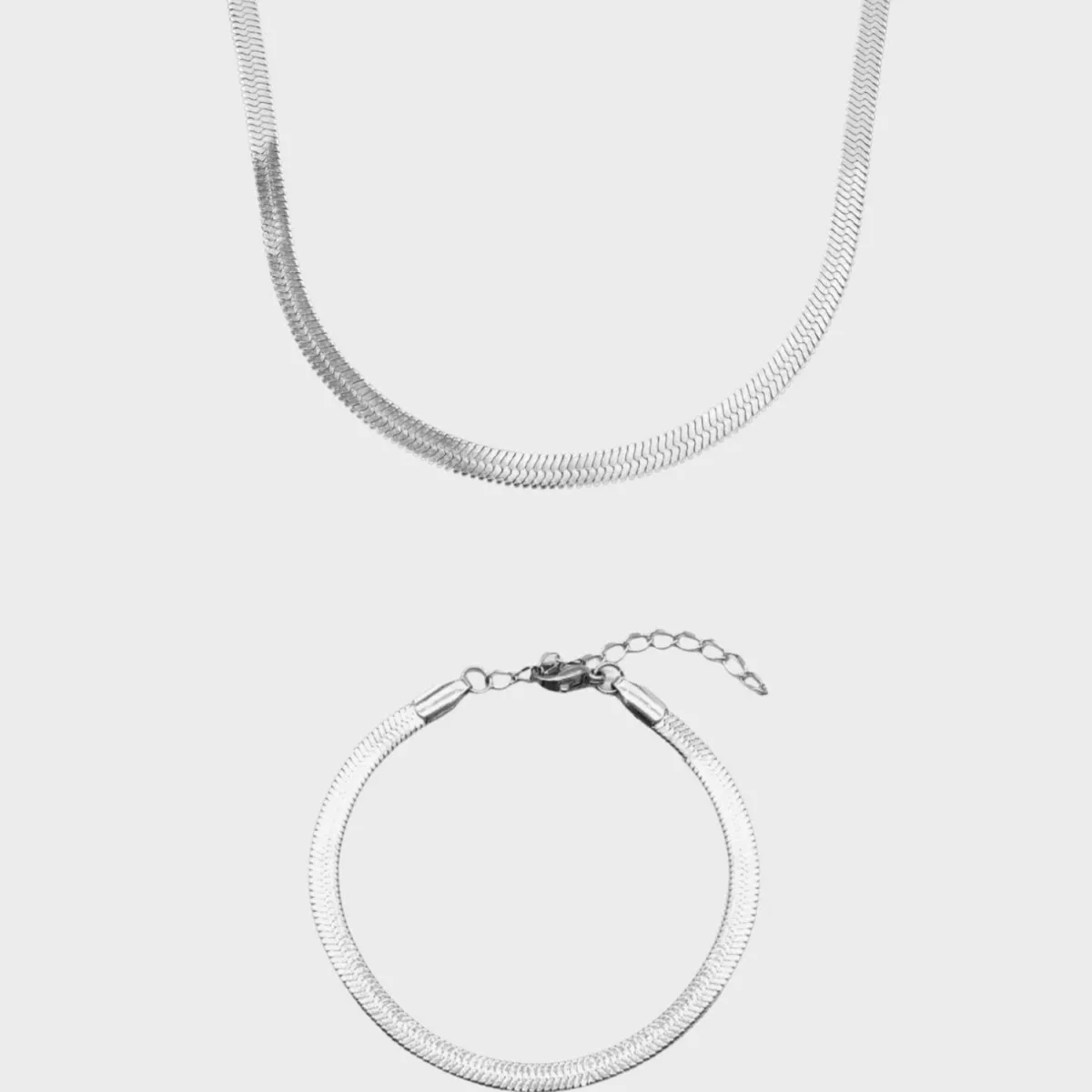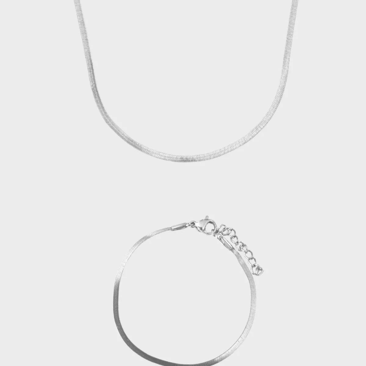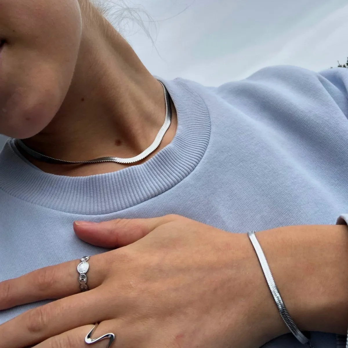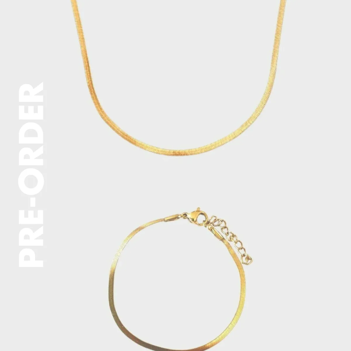 Slangekæde mix guldfarvet i vandfast materiale. Sættet består af vores Flat Snake halskæde og vores Flat snake armbånd. Dette slangekæde smykkesæt er det perfekte simple mix til din smykkesamling. Slangekæden er en tidløs kæde, der passer til det meste og er nem at style med andre smykker. Derfor er vores slangekæde smykke mix perfekt til din smykkesamling!