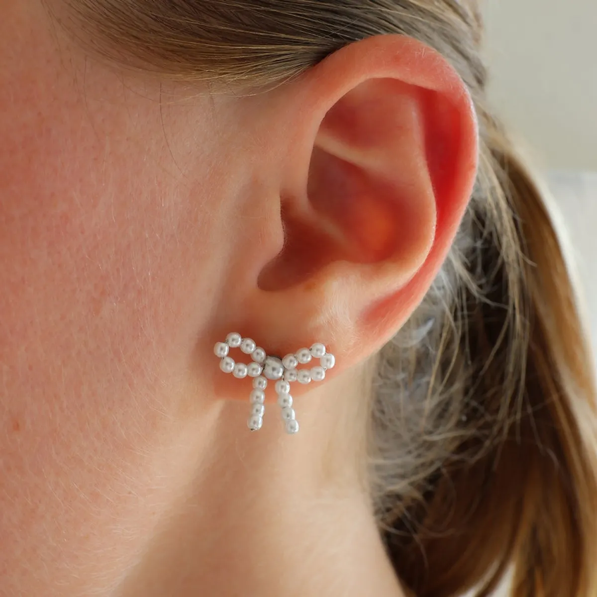 Disse yndige perleøreringe er formet som små sløjfer, der tilføjer et feminint og elegant touch til dit look. De flotte perler og det fine design gør dem perfekte til både hverdag og særlige lejligheder, hvor du ønsker at fremhæve din stil med et sødt og sofistikeret smykke.