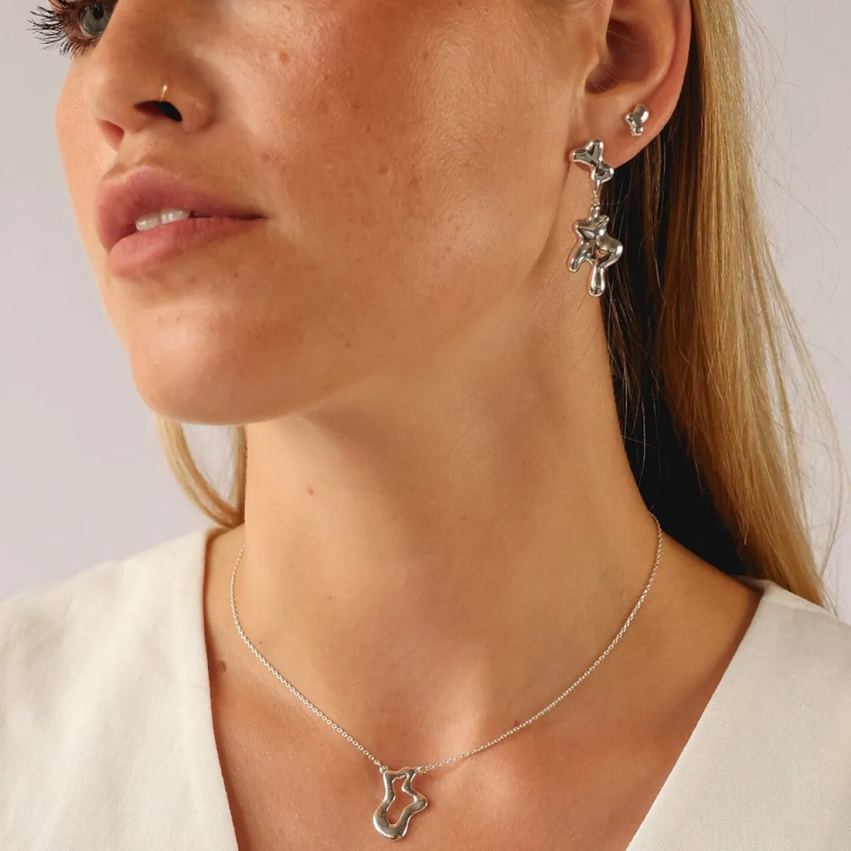 Nimbo Drop øreringene, skabt i samarbejde med Sidsel Juel, er en del af en smykkekollektion inspireret af hendes livslange fascination af himlen. Øreringene har organiske former og hænger smukt fra øret, hvilket giver en drømmende og elegant effekt.