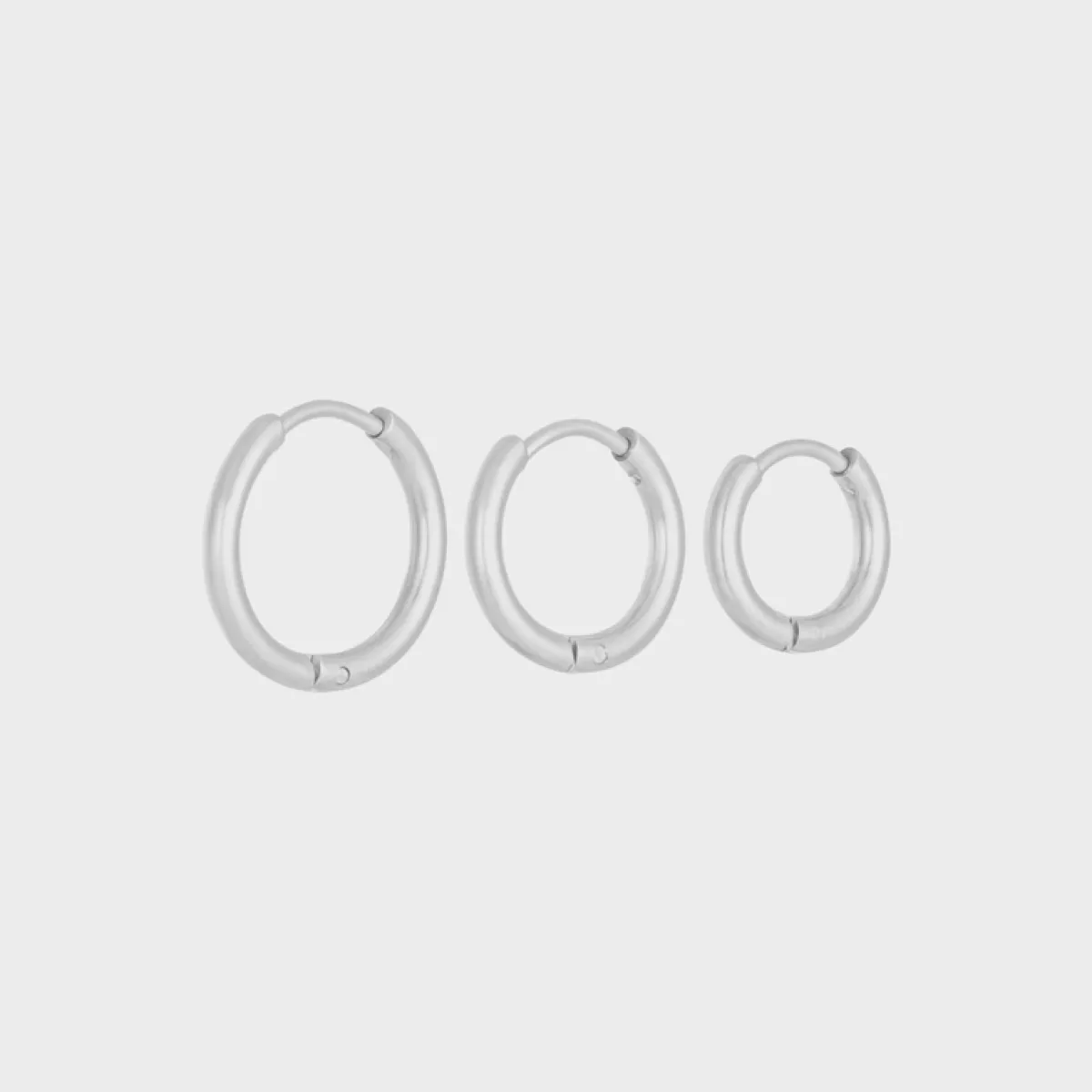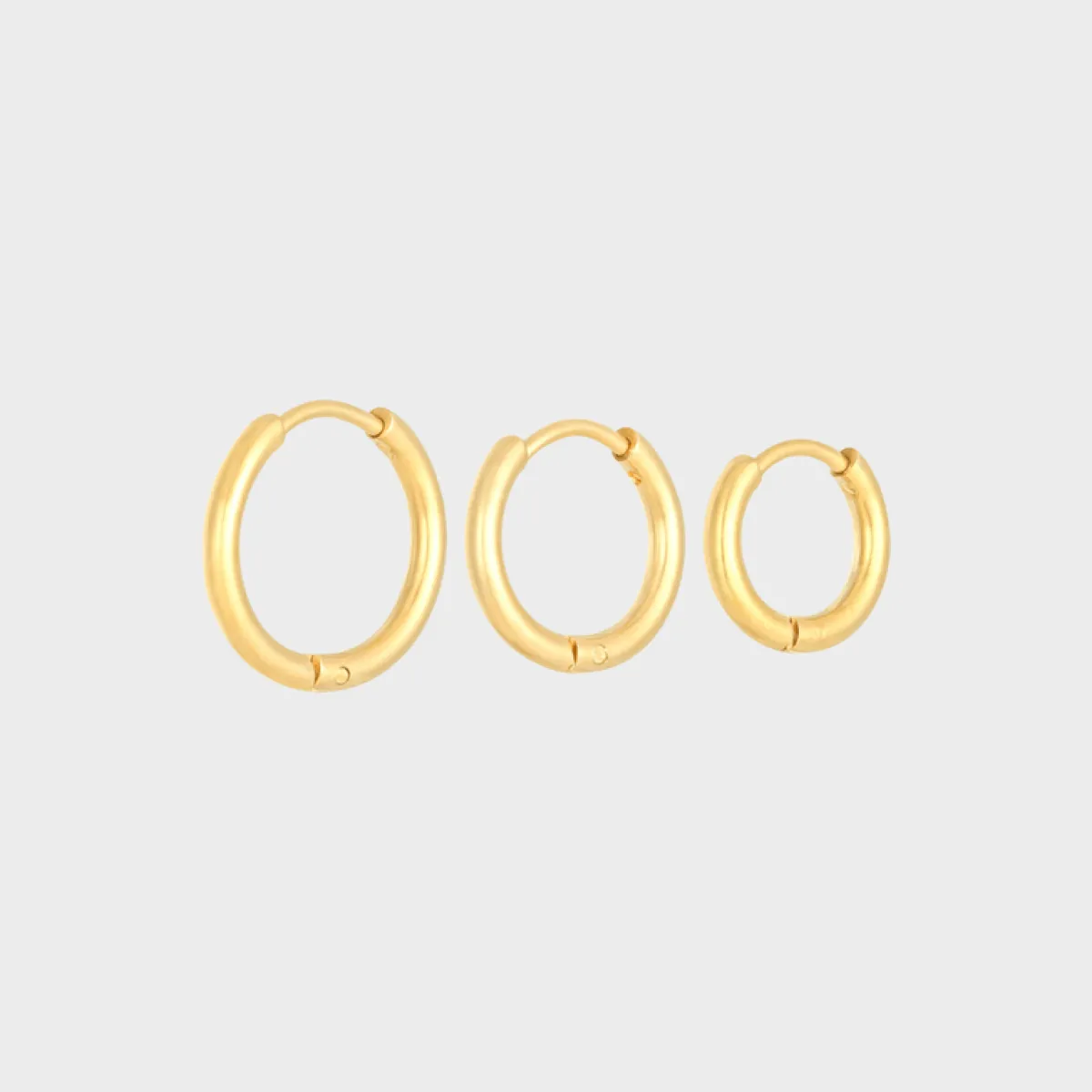 Små hoops i tre forskellige størrelser i et helt simpelt design. Sættet består af 3 små basic hoops, 1 stk. i størrelse 1,2cm, 1 stk. i størrelse 1,4cm, 1 stk. i størrelse 1,6cm. Hoop sættet er et must have i din smykkesamling. Små hoops er nemlig både klassisk, moderne og tidsløse og passer til enhver stil og outfit. Hoop øreringene har en klik-lås, som gør dem nemme at låse fast i øret uden at skulle fumle med en lås. Er du til et mere detaljeret look kan du se vores Crystal hoop set som er små hoops med sten i samme princip. Begge sæt indeholder 3 små øreringe, så hvis du ønsker at have til begge øre skal du lægge 2 par i kurven.